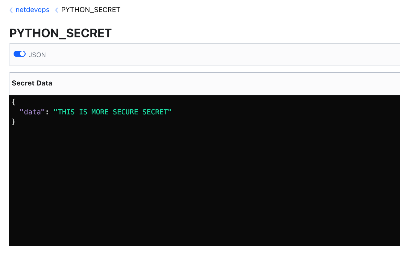 You can verify this by checking the GUI view. Navigate to the netdevops secrets engine and click on the PYTHON_SECRET secret. If the operation was successful, you should see the new or updated value for this secret.