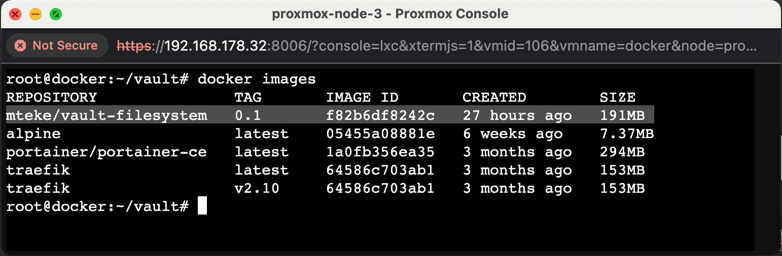 root@docker:~/vault# docker build -t mteke/vault-filesystem:0.1 .Upon successful creation of the image, you can verify its existence using the docker images command.