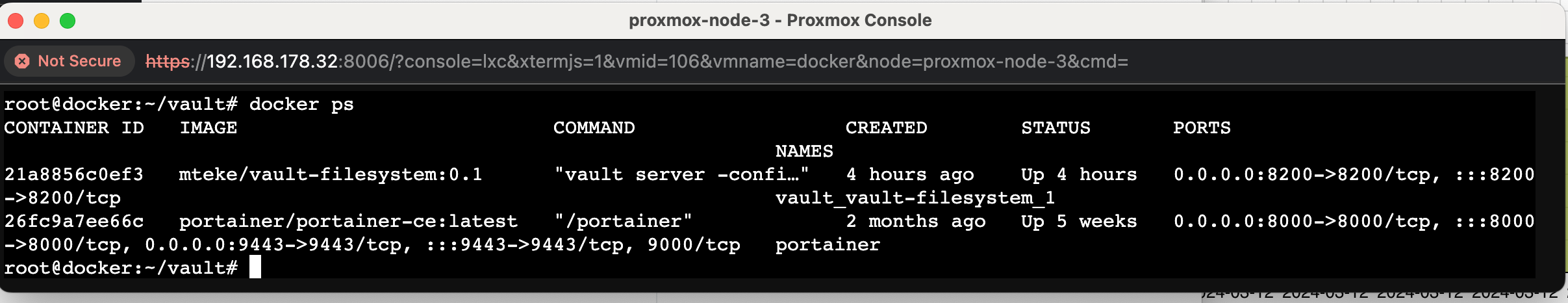 root@docker:~/vault# docker-compose up -d vault-filesystemThis command will start the vault-filesystem service as defined in your docker-compose.yml file, and the -d option will run it in detached mode, meaning it will run in the background.