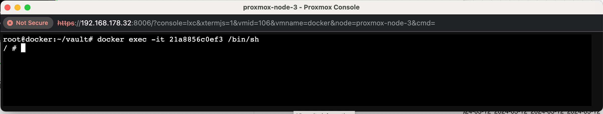 root@docker:~/vault# docker exec -it 21a8856c0ef3 /bin/shThis command will start an interactive shell session (/bin/sh) inside the container with ID 21a8856c0ef3. Please replace 21a8856c0ef3 with the actual ID of your running container.
