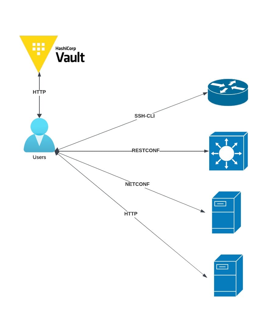 In below drawing, the user interacts with Vault to get the secrets needed to interact with network devices and servers. This means the actual credentials for those devices and servers are never exposed to the user, increasing the security of your system.